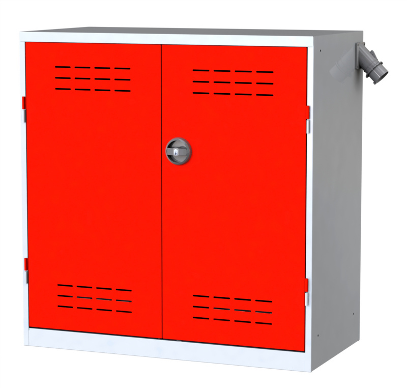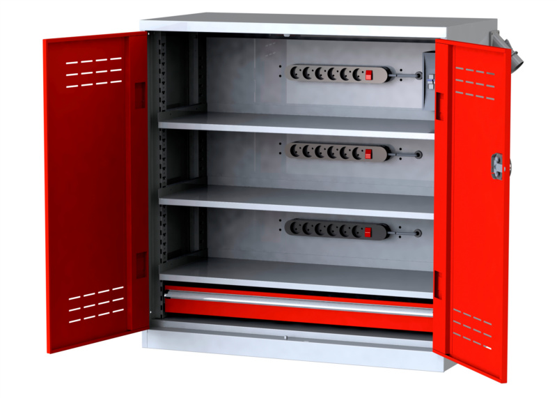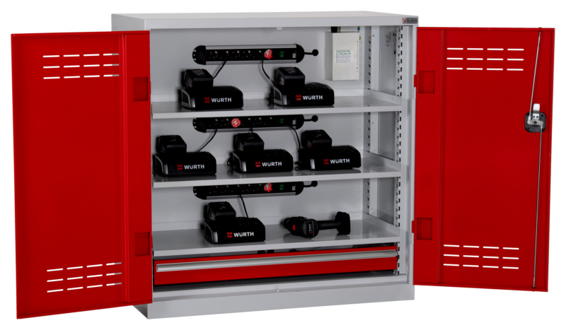 Kurzbeschreibung: Akkuladeschrank mit Flügeltüren - Übersichtliche, saubere und sichere Lagerung von Akkuladegeräten und Akkumaschinen
