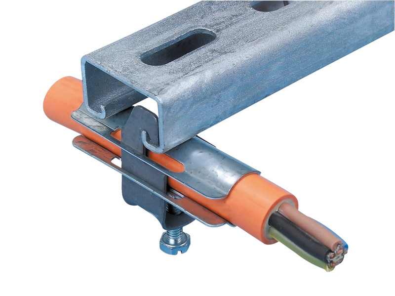 Kabelschelle feuerverzinkt, mit ganzflächiger Druckwanne aus Stahl, für die Befestigung an Profilschienen mit Schlitzweite 18/22 mm.Anwendungsgebiet: Zur vertikalen oder horizontalen Einzel- und Bündelverlegung von Leitungen, Kabeln, Brandschutzkabeln sowie starren Elektroinstallationsrohren (nicht Bestandteil der gutachterlichen Stellungnahme) an Wand und Decke