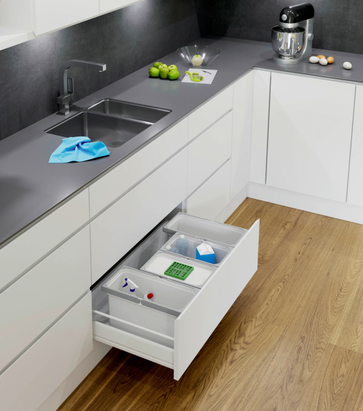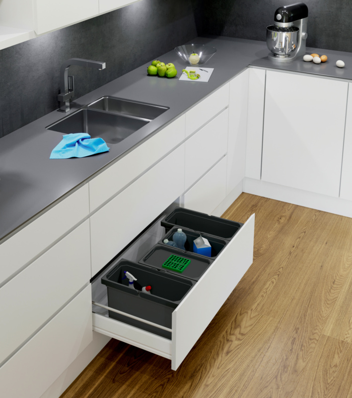 Eimerhöhen 216, 256 und 326 mm Eimervolumen von 5,5 bis 29 Liter In 2 Farbvarianten, grau und anthrazit Übersichtliche Abfalltrennung – die verschiedenen Behälter ermöglichen es verschiedene Arten von Abfall getrennt voneinander zu lagern Behälter aus lebensmittelechtem Kunststoff, welche auch geeignet sind zur Aufbewahrung von z.B. Tiernahrung oder anderen Lebensmitteln Behälter sind leicht zu reinigen und bis zu 70° spülmaschinenfest Behältergriffe dienen zu Befestigung von Müllbeuteln und einfacher Entnahme der Behälter Optional gibt es für die Behälter auch geschlossene Deckel und Bio-Deckel mit Aktivkohlefilter zur Abdeckung Jederzeit nachrüstbar