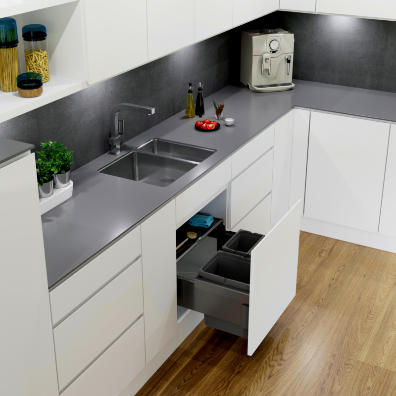 Kurzbeschreibung: Mülltrennsystem VS ENVI Space / ENVI Space S - Für den bequemen und vollständigen Zugriff auch auf die hinteren Eimer durch synchronisierte Führung Nova Pro mit Vollauszug, integrierter Dämpfung und Selbsteinzug