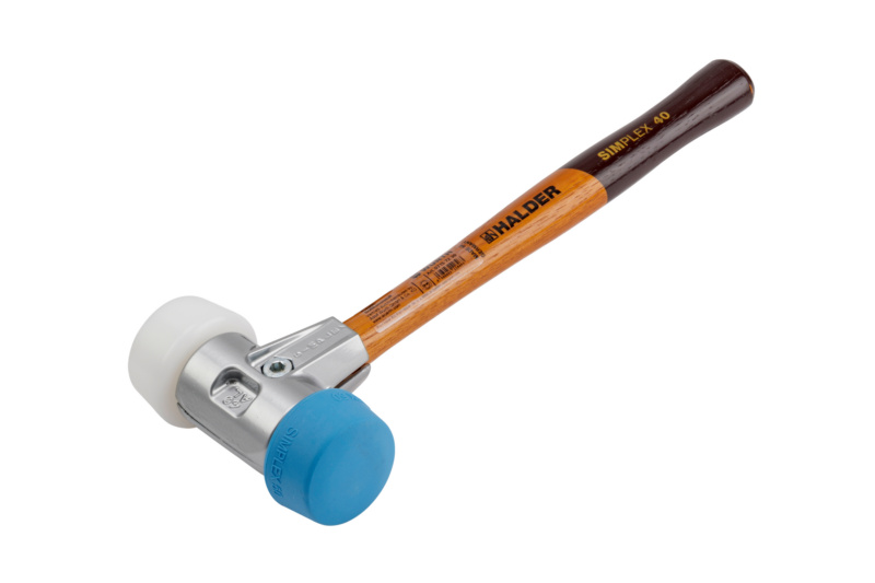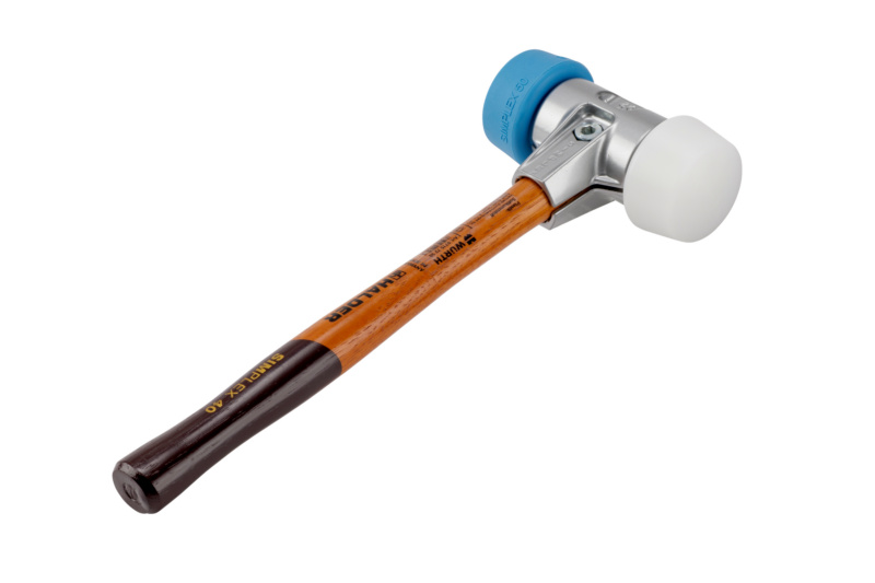 Kurzbeschreibung: SIMPLEX Schonhammer - mit der Einsatzkombination Plastik-Softkunststoff - Hammer mit ergonomischem Holzgriff, Aluminiumgehäuse und auswechselbaren Schlageinsätzen