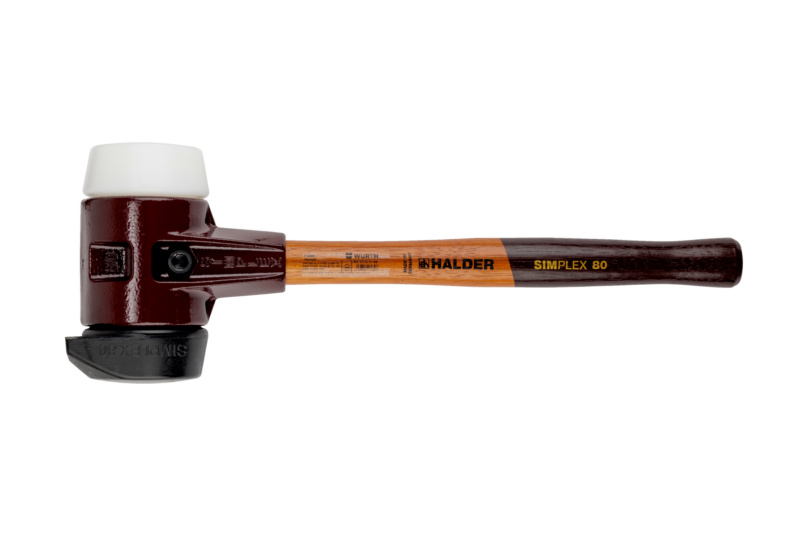 Kurzbeschreibung: SIMPLEX Schonhammer - mit der Einsatzkombination Plastik-Gummi - Hammer mit ergonomischem Holzgriff, Tempergussgehäuse und auswechselbaren Schlageinsätzen