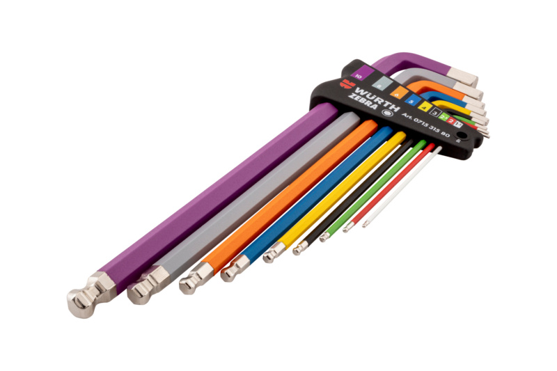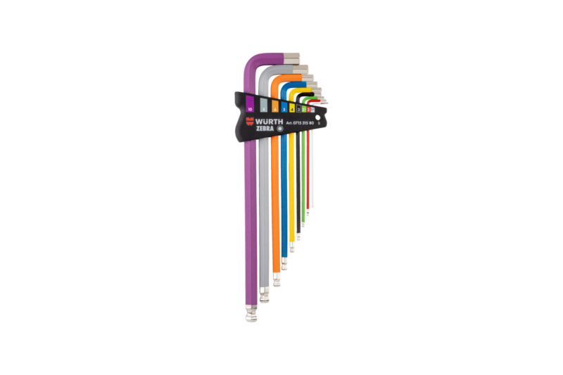 Kurzbeschreibung: Winkelschraubendreher-Satz Innensechskant - 9-tlg. - Mit Kugelkopf, extra lange Ausführung, pulverbeschichtetes Würth Farbleitsystem, im Kunststoffhalter