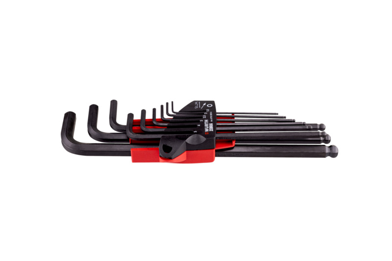 Kurzbeschreibung: Winkelschraubendreher-Satz RW Edition - 9-tlg. - Innensechskant mit Kugelkopf, extra lange Ausführung, im Kunststoffhalter mit Schiebefunktion